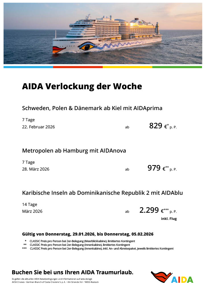 • AIDA – bei Buchung bis 2. März zusätzlich sparen! 29. Januar 2026